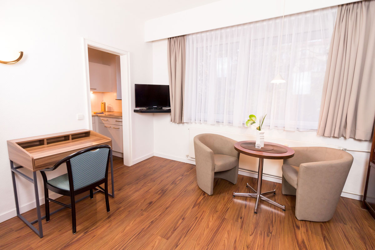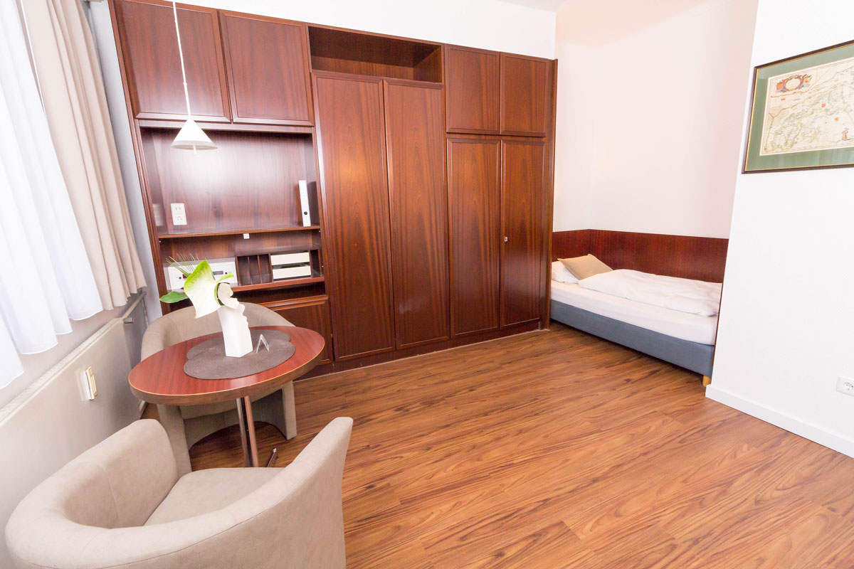 Buchen Sie Ihr Wunschapartment: Einbett oder Doppelbett, mit Balkon oder im Erdgeschoss, Südseite oder mit Blick auf den schönen Garten. Je nach Apartment-Typ haben Sie die Wahl zwischen den Größen 26, 30, 32 und 44 m².